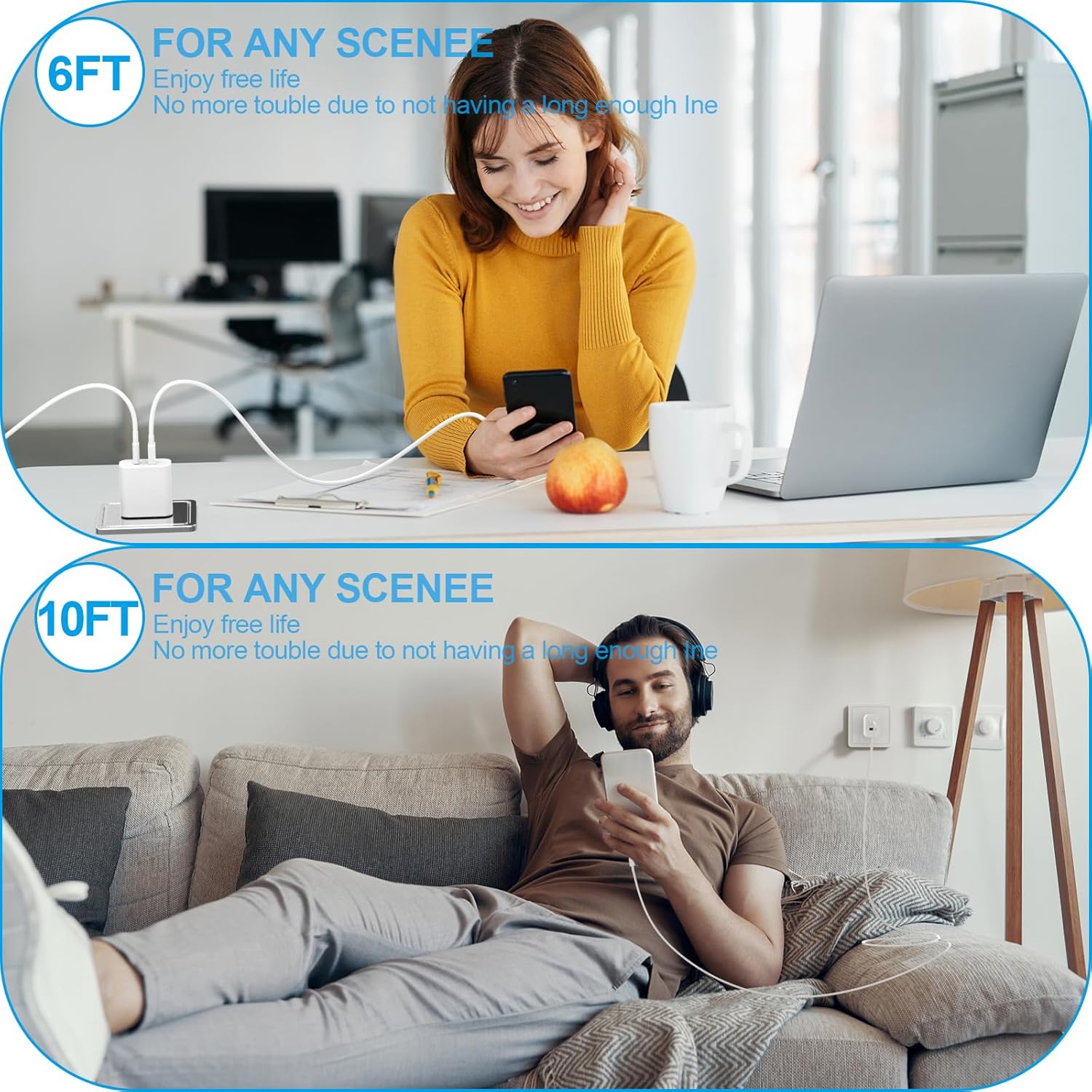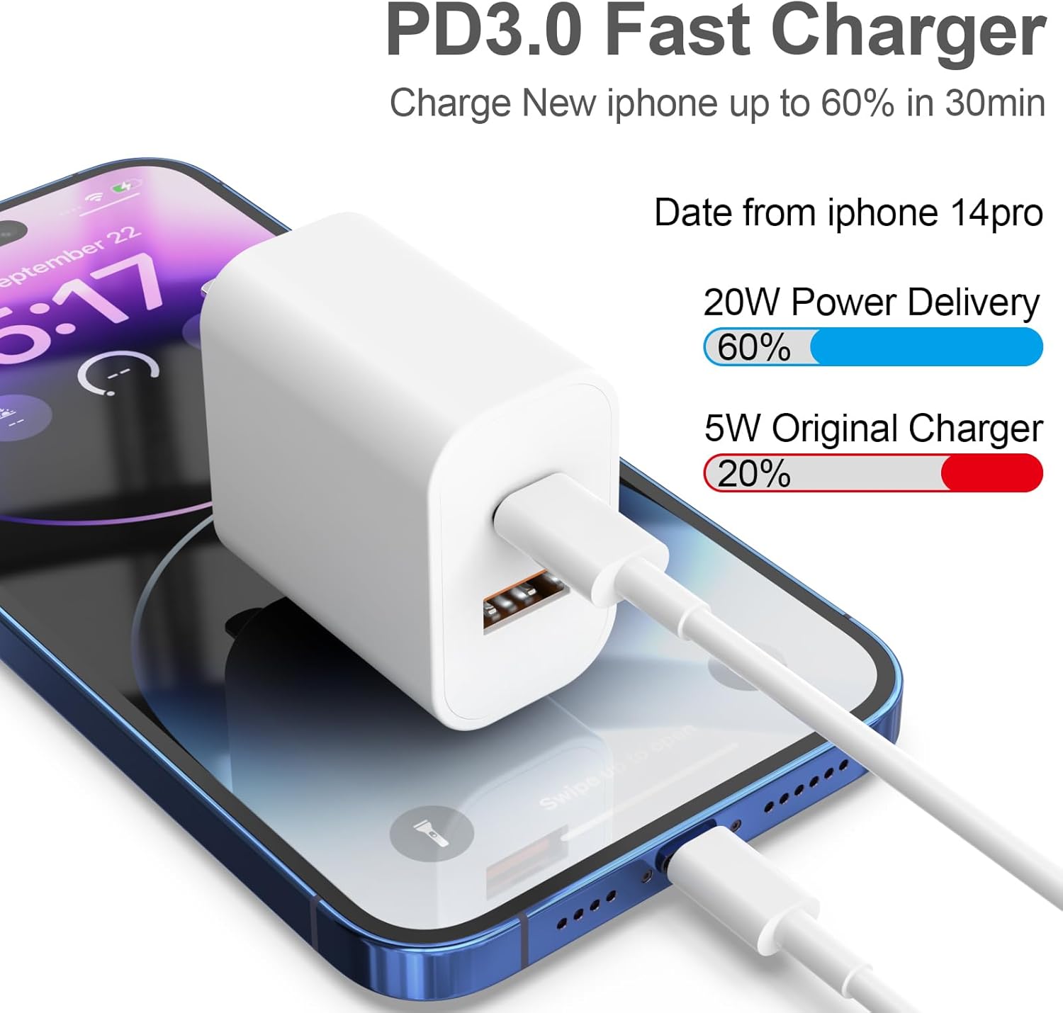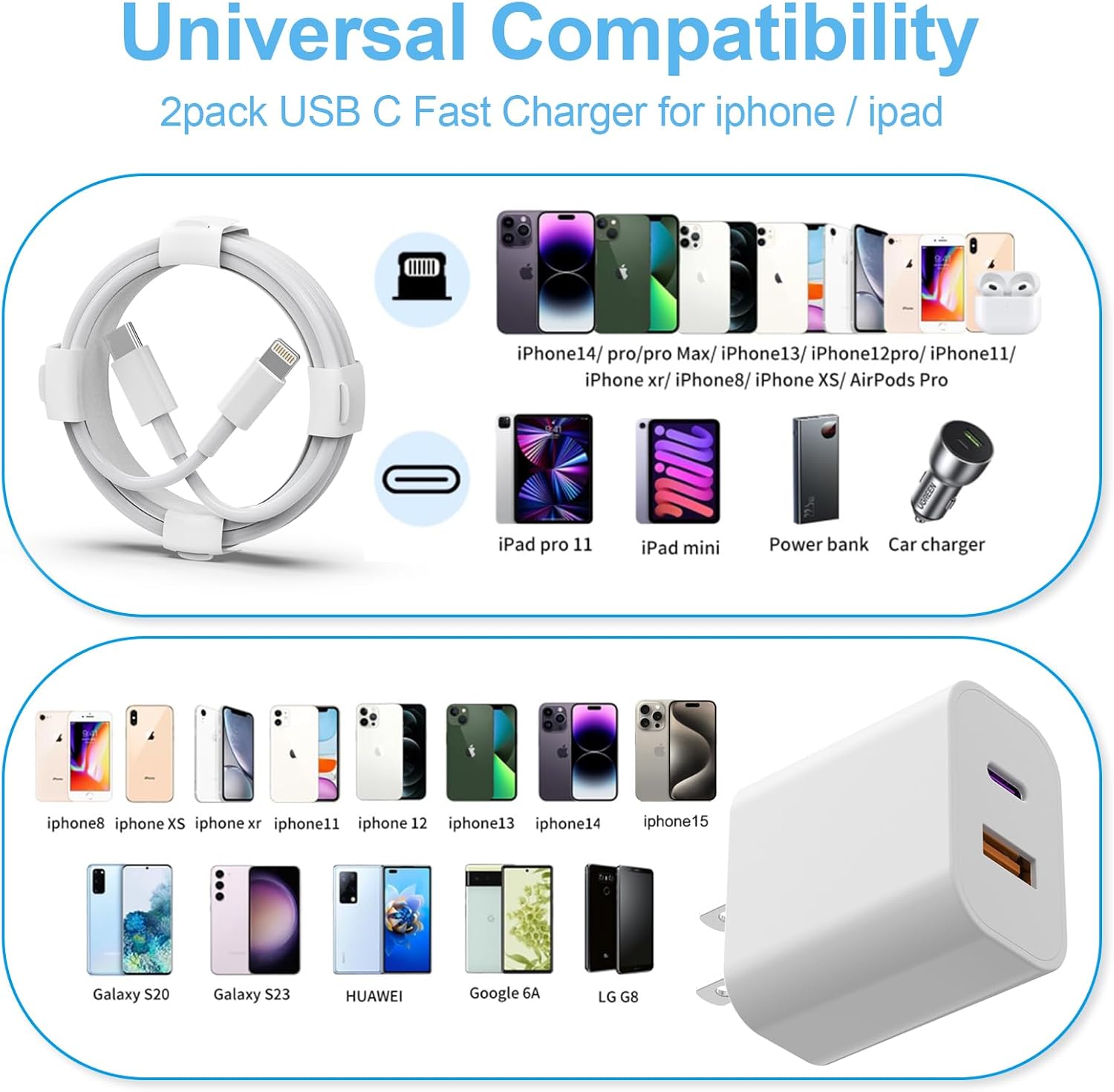 Compatible with a wide range of Apple devices, including iPhone 14/13/12/11 Pro Max/XS/XR/X, iPad, and AirPods Pro, this charger block set delivers lightning-fast charging speeds to keep you connected and powered up throughout the day. The dual-port design allows you to charge two devices simultaneously, saving you time and ensuring all your devices stay fully charged.